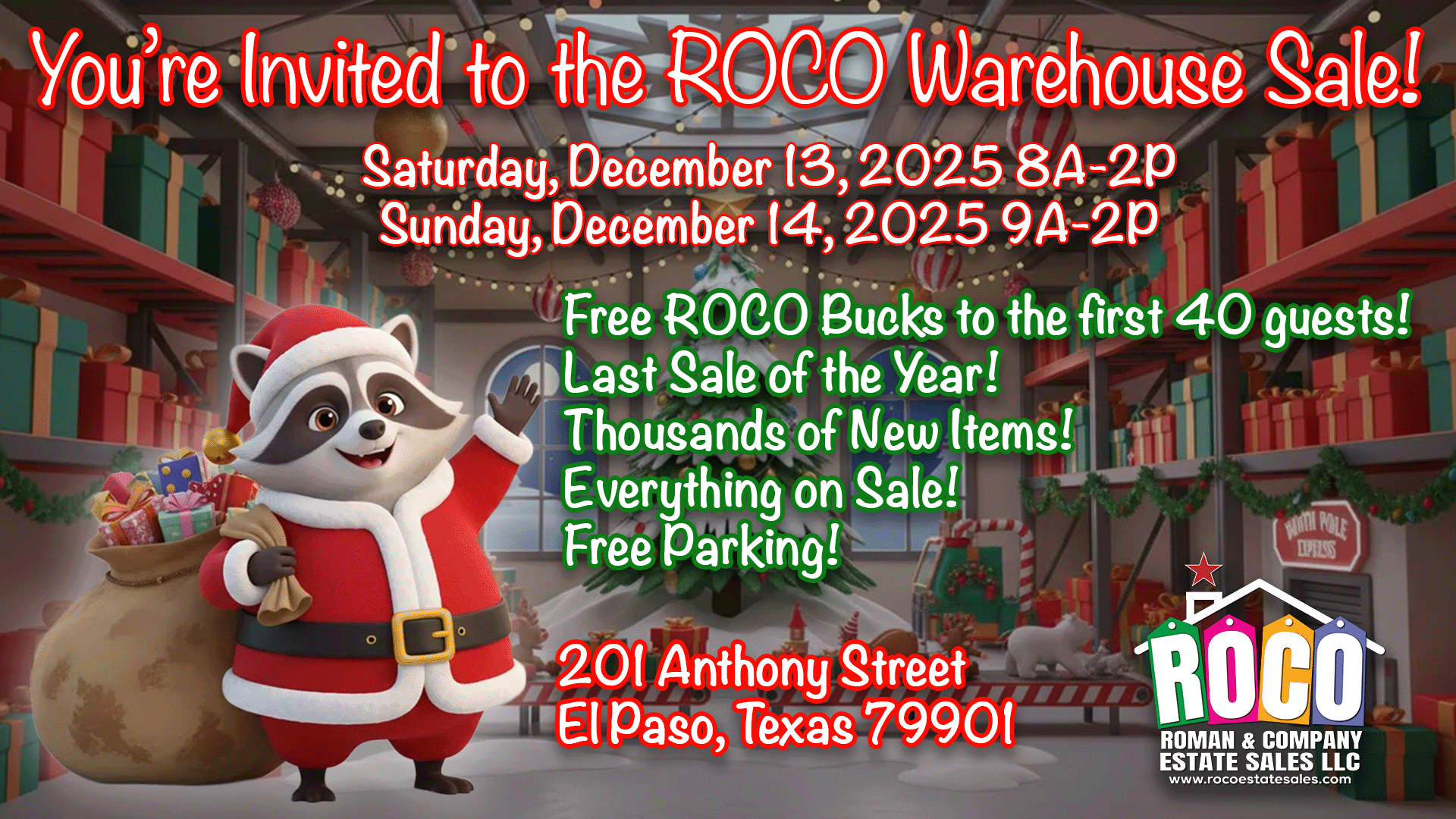 Roman and Company Estate Sales invites you to join us this weekend as we celebrate our last sale of the year on Saturday, December 13 8A-2P and Sunday , December 14, 2025 9A-2P at the ROCO Warehouse located downtown at 201 Anthony Street, El Paso TX 79901. Shop thousands of new items discounted at 75-90 percent off Free parking!